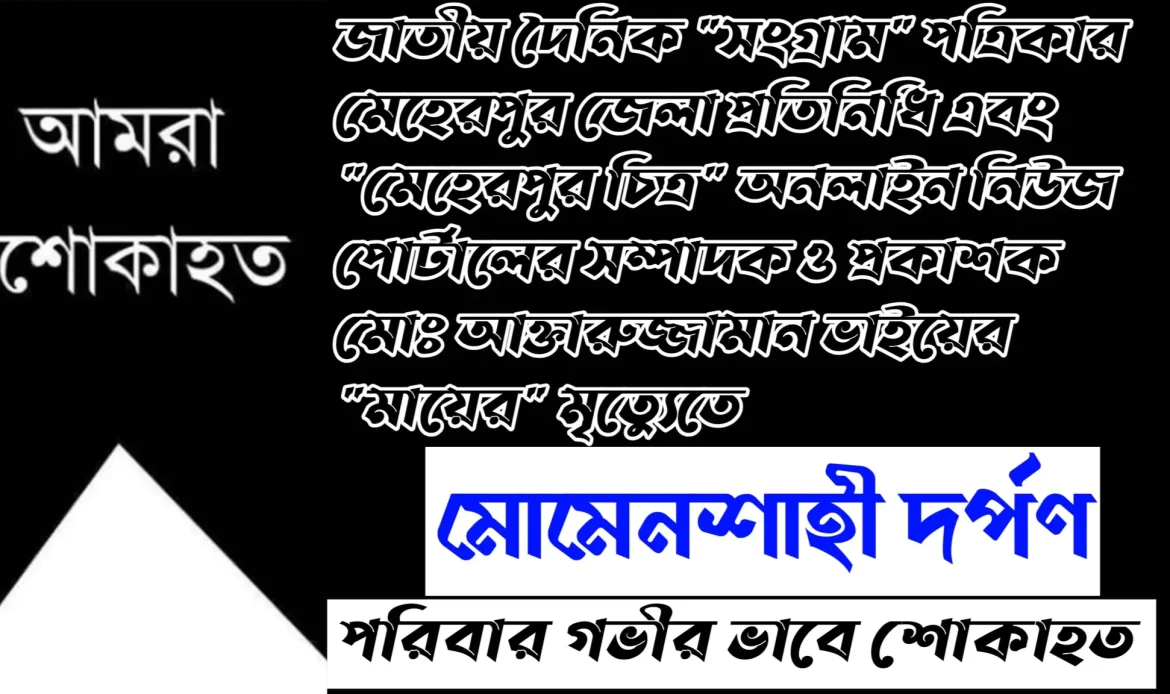 জাতীয় দৈনিক “সংগ্রাম” পত্রিকার মেহেরপুর জেলা প্রতিনিধি এবং “মেহেরপুর চিত্র” অনলাইন নিউজ পোর্টালের সম্পাদক ও প্রকাশক মোঃ আক্তারুজ্জামান ভাইয়ের মায়ের মৃত্যুতে মোমেনশাহী দর্পণ, খুলনা সাহিত্য একাডেমি , খুলনা সম্মিলিত লেখক ফোরাম , বৃহত্তর খুলনা কবি লেখক ঐক্য পরিষদ, উন্মীলন সাহিত্য ও সমাজ কল্যাণ সংগঠন, খুলনা স্কুল অনলাইন এডুকেশন পরিবার, পরকালের কাফেলা ও আমরা জনতার বন্ধু (আজব) সংগঠনের পক্ষ থেকে গভীর শোক ও সমবেদনা প্রকাশ করেছে। শোকাহত পরিবারের প্রতি সমবেদনাা জ্ঞাপন করে বিবৃতি প্রদান করেছেন বিশিষ্ট বেতার ব্যক্তিত্ব অধ্যাপক শেখ আজিজুল ইসলাম টিপু, বৃহত্তর ঢাকা বিভাগীয় কল্যাণ সমিতির সভাপতি মোঃ জুবায়েদ হোসেন, রফিকুল হাসান মুন্না, হায়দার আলী, বাগেরহাট জেলা সমিতির সাধারণ সম্পাদক শেখ হারুন অর রশিদ, বাগেরহাট জেলা সমিতির সিনিয়র সহসভাপতি মাওলানা মুজিবুর রহমান, সিবিএ’র সমাজ কল্যাণ সম্পাদক নাসির উদ্দীন পাটোয়ারী, মোংলা পোর্ট মাধ্যমিক বিদ্যালয়ের সিনিয়র শিক্ষক মোঃ শফিকুল ইসলাম, আব্দুল মান্নান ও বাবুল হোসেন। অন্যান্যের মধ্যে উপস্থিত ছিলেন নাহিদ হোসেন কাকন, ফিরোজ আহমেদ, এনায়েত হোসেন, ইমরান হোসেন, ইউসুফ আলী, মিজানুর রহমান, তরিকুল ইসলাম, শাফায়াত হোসেন, দুলাল মিয়া, নুরুল ইসলাম, শাহজাহান হোসেন, মৃন্ময়, জামাল উদ্দিন, জাহিদ হোসেন প্রমুখ।
