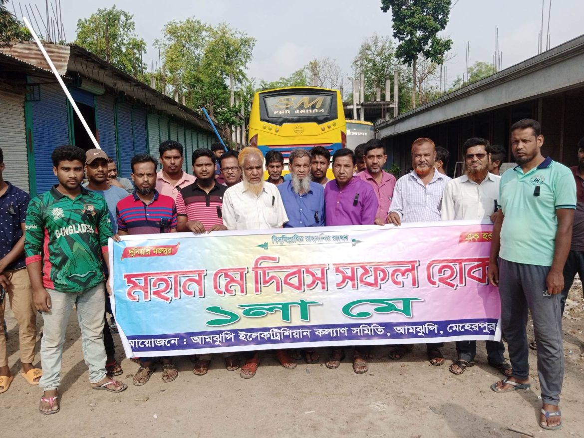 মেহেরপুর সদর উপজেলা আমঝুপি ইলেকট্রিশিয়ান কল্যাণ সমিতির উদ্যোগে মহান মে, দিবসে আলোচনা ও র‍্যালি অনুষ্ঠিত হয়েছে । আজ সকা ৮ টার সময় আমঝুপি বাজারের প্রধান প্রধান সড়ক প্রদক্ষিণ করে র‍্যালিটা সমিতির নিজস্ব কার্যালয়ে গিয়ে শেষ হয়। আলোচনা সভা অনুষ্ঠানের সভাপতিত্বে করেন ইলেকট্রিশিয়ান কল্যাণ সমিতির সভাপতি নজরুল ইসলাম। প্রধান অতিথি হিসেবে উপস্থিত ছিলেন সমিতির উপদেষ্টা আমঝুপি ইউনিয়ন পরিষদের চেয়ারম্যান জনাব বোরহান উদ্দিন, সাবেক সমাজসেবক কর্মকর্তা মোহাম্মদ ফারুক হোসেন, বিশেষ অতিথি হিসেবে উপস্থিত ছিলে বীর মুক্তিযোদ্ধা মাহাবুল আলম , বিশিষ্ট ব্যবসায়িক আবু সাদাত (খোকন), জনাব সুজন, আলামিন। বক্তব্য রাখেন সমিতির সাধারণ সম্পাদক সাংবাদিক আকতারুজ্জামান, সমিতির সহ-সভাপতি এনামুল হক মন্টু, মিজানুর রহমান, মোহাম্মদ এরশাদ আলী, মোঃ হেলাল,মোঃ হাসান আলী , আজিজুর রহমান, আমিরুল ইসলাম, মহর আলী, তুষার আহমেদ, মোঃ শিখন, জাহাঙ্গীর আলম(পুটু), মোহাম্মদ লিটন, রবিউল ইসলাম, মনিরুল ইসলাম, তোফাজ্জল হোসেন, মোঃ রিপন আলী, সজীব আহমেদ, প্রমূখ্য উপস্থিত ছিলেন।