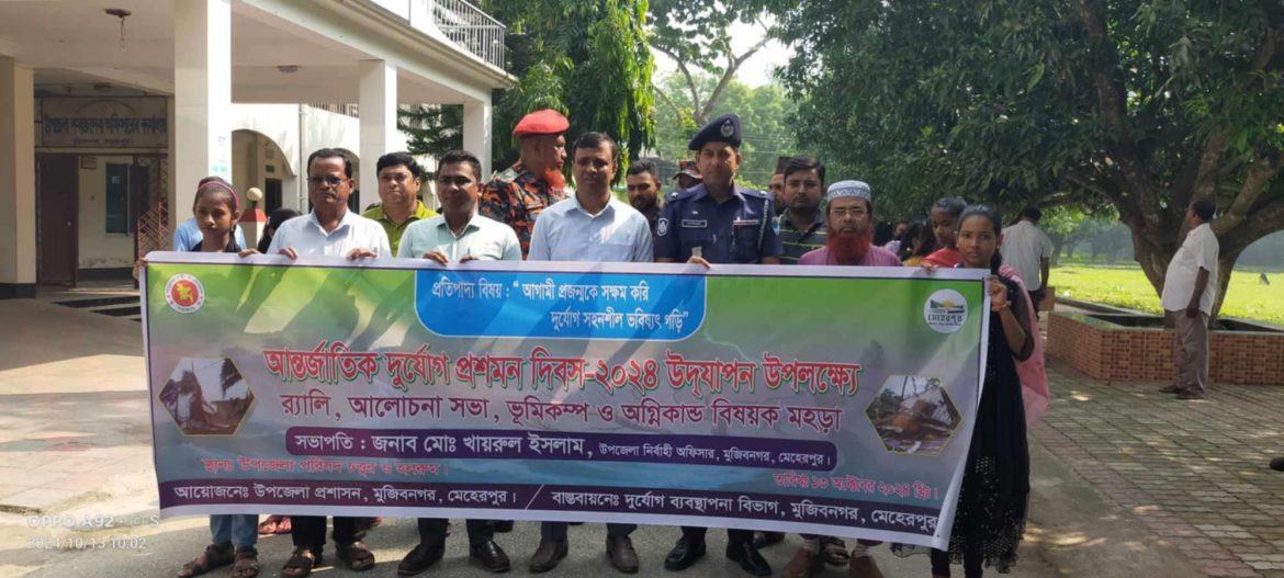 মুজিবনগরে “আগামী প্রজন্মকে সক্ষম করি দুর্যোগ সহনশীল ভবিষ্যৎ গড়ি” এই প্রতিপাদ্যে পালিত হয়েছে আন্তর্জাতিক দুর্যোগ প্রশমন দিবস-২০২৪। মুজিবনগর উপজেলা প্রশাসনের আয়োজনে এবং উপজেলা দুর্যোগ ব্যবস্থাপনা বিভাগ এর বাস্তবায়নে,আন্তর্জাতিক দুর্যোগ প্রশমন দিবস-২০২৪ উদ্যাপন উপলক্ষ্যে র‍্যালি, আলোচনা সভা, ভূমিকম্প ও অগ্নিকান্ড বিষয়ক মহড়া অনুষ্ঠিত হয়েছে। দিবসটির পালন উপলক্ষে সকালে উপজেলা নির্বাহী অফিসারের নেতৃত্বে একটি বর্ণাঢ্য র‍্যালি উপজেলা পরিষদ থেকে শুরু হয়ে প্রধান সড়ক প্রদক্ষিণ শেষে উপজেলা পরিষদ চত্বরে এসে শেষ হয় সেখানে উপজেলা ফায়ার ব্রিগেড ও সিভিল ডিফেন্সের তত্ত্বাবধানে ভূমিকম্প ও অগ্নি নির্বাপক মহড়া অনুষ্ঠিত হয়। বিশেষ করে ভাসমান পানির উপরে লাগা আগুন কিভাবে নেভাতে হয় গ্যাস সিলিন্ডারে লাগা আগুন কিভাবে নেভাতে হয় এবং বহুতল ভবনে অগ্নিকাণ্ড ঘটলে ফায়ার ফাইটাররা কিভাবে আগুন নির্বাপন করে তার মহড়া অনুষ্ঠিত হয়। পরে উপজেলা পরিষদ মিলোনায়তনে দিবস টি উপলক্ষে উপজেলা নির্বাহী অফিসার খাইরুল ইসলামের সভাপতিত্বে এবং দুর্যোগ ব্যবস্থাপনা বিভাগ ও প্রকল্প বাস্তবায়ন অফিসার মাশরুবা আলমের সঞ্চালনায় আলোচনা সভা অনুষ্ঠিত হয়। র‍্যালী ও আলোচনা সভায় উপস্থিত ছিলেন, মুজিবনগর থানা অফিসার ইনচার্জ তদন্ত আমিনুল ইসলাম, উপজেলা ফায়ার ব্রিগেড ও সিভিল ডিফেন্স কর্মকর্তা শাহজাহান আলী, মুজিবনগর প্রেসক্লাবের সভাপতি মুন্সি ওমর ফারুক প্রিন্সসহ উপজেলার কর্মকর্তা কর্মচারী এবং মুজিবনগর শিশু পরিবারের ছাত্র ছাত্রীরা।