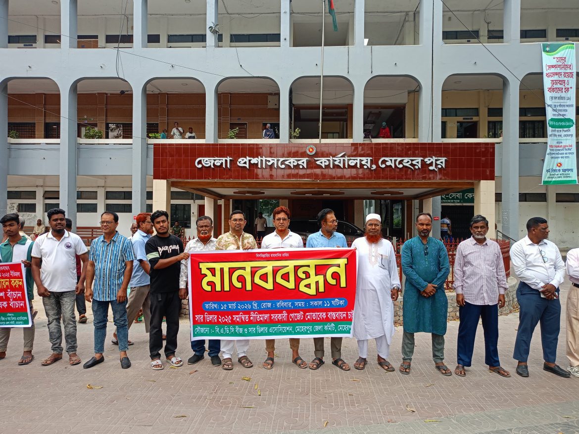 সার নীতিমালা ২০২৫ এর দ্রুত বাস্তবায়নের মাধ্যমে প্রত্যেক সার ডিলারকে সকল সরবরাহের মাধ্যমে কৃষকদের ন্যায্য মূল্য সময় মত সার সরবরহের দাবিতে মানববন্ধন করা হয়েছে। গতকাল রবিবার সকালের দিকে মেহেরপুর জেলা প্রশাসনের কার্যালয় চত্বরে মেহেরপুর জেলা বিএডিসি বীজ ও সার ডিলার অ্যাসোসিয়েশনের উদ্যোগে মানববন্ধন কর্মসূচি পালন করা হয়। মেহেরপুর জেলা বিএডিসি বীজ ও সার ডিলার অ্যাসোসিয়েশনের সভাপতি সাইদুল হাসান খান কেনেডির নেতৃত্বে মানববন্ধনে অন্যদের মধ্যে সাধারণ সম্পাদক মোল্লা তামিম হোসেন, সদর উপজেলা সভাপতি ফখরুল ইসলাম, সাধারণ সম্পাদক সোহরাব হোসেন রতন, গাংনী উপজেলা সভাপতি আব্দুল্লাহ ফারুক, সম্পাদক শওকত আলী, তৌহিদ মোর্শেদ অতুল, জালাল উদ্দিন, দেলোয়ার হোসেন প্রমুখ উপস্থিত ছিলেন। পরে জেলা প্রশাসকের মাধ্যমে কৃষিমন্ত্রী, খাদ্যমন্ত্রী, মৎস্য ও প্রাণিসম্পদ মন্ত্রী বরাবর একটি স্মারকলিপি প্রদান করা হয়।
