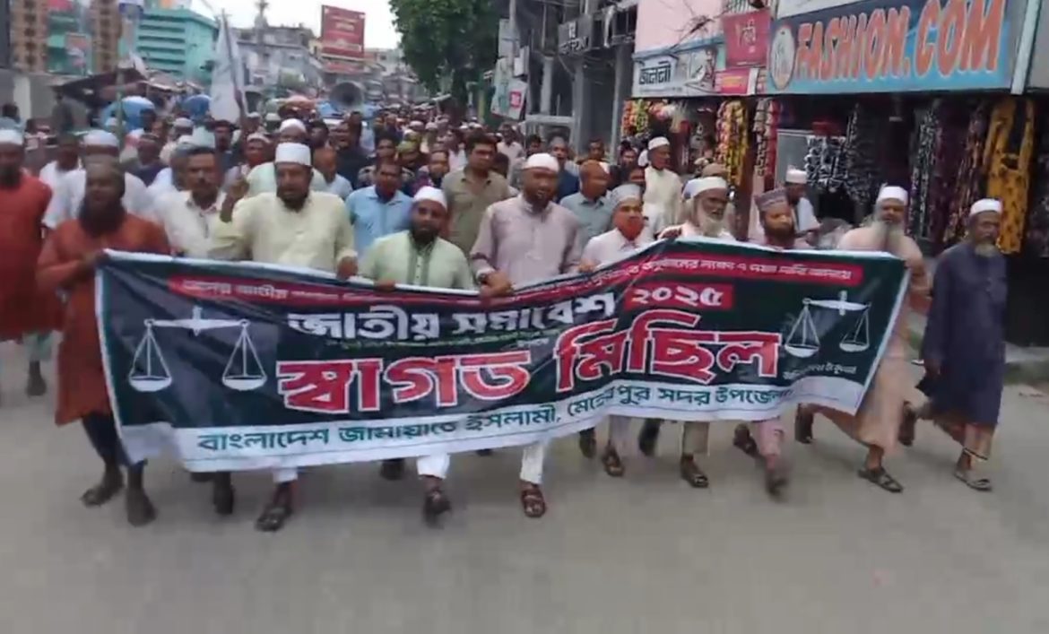 মেহেরপুরে জামায়াতের উদ্যোগে আগামী ১৯শে জুলাই ঢাকা সরোয়াদি উদ্যানে মহাসমাবেশ কে স্বাগত জানিয়ে মিছিল অনুষ্ঠিত হয়েছে। আজ বৈকাল সাড়ে ৫ টার সময় মেহেরপুর কোট চাত্তর থেকে শুরু হয়ে বড় বাজার পর্যন্ত গিয়ে শেষ হয়। এই মিছিলে অংশগ্রহণ করেন মেহেরপুর জেলা জামায়াতের জেলা সেক্রেটারি ইকবাল হুসাইন, জেলা নায়েবে আমীর মাওলানা মহাবুব উল আলম, সদর উপজেলা আমীর মাওলানা সোহেল রানা, মেহেরপুর পৌর আমীর সোহেল রানা ডলার, সদর উপজেলা সেক্রেটারি জাব্বারুল ইসলাম, এ সময় জামায়াতে নেতাকর্মীরা এই মিছিলে অংশগ্রহণ করেন। মিছিল শেষ সংক্ষিপ্ত বক্তব্যই প্রধান অতিথি বলেন আগামী নির্বাচন কেউ যদি মনে করে আওয়ামী লীগের মতন দিনের ভোটে রাত্রে করব তাহলে সেটা স্বপ্নই রয়ে যাবে। সরকারকে বলবো ন্যায় এবং ইনসাফ ভিত্তিক ও ফ্রী ফেয়ার ইলেকশন চাই।আগামী ২৯ শে জুলাই মহাসমাবেশে মেহেরপুর সহ সারা বাংলাদেশের তৌহিদী জনতা অংশগ্রহণ করবে।