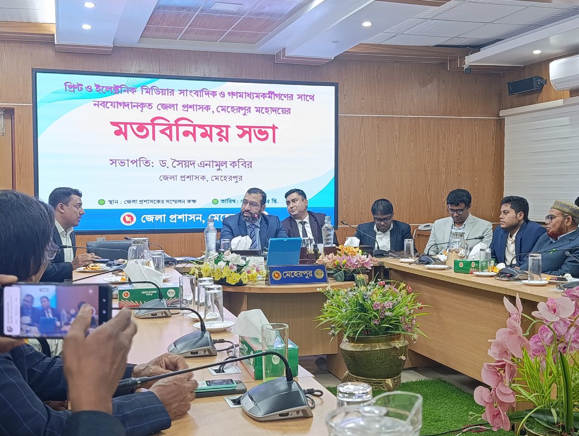 সভায় সভাপতিত্ব করেন জেলা প্রশাসক ড. সৈয়দ এনামুল কবির। তিনি বলেন, “মেহেরপুরের উন্নয়ন ও প্রশাসনিক কর্মকাণ্ডে গণমাধ্যম অত্যন্ত গুরুত্বপূর্ণ ভূমিকা পালন করে। উন্নয়নের এই অগ্রযাত্রাকে ত্বরান্বিত করতে প্রশাসন ও গণমাধ্যমের মধ্যে স্বচ্ছ যোগাযোগ এবং পারস্পরিক সহযোগিতা অপরিহার্য।” তিনি জেলার সার্বিক উন্নয়নে সাংবাদিকদের আন্তরিক সহযোগিতা কামনা করেন এবং সাংবাদিকদের যেকোনো প্রয়োজনে প্রশাসনের দরজা সবসময় খোলা থাকবে বলে আশ্বাস প্রদান করেন।