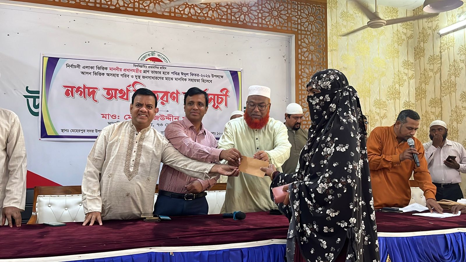 পবিত্র ঈদুল ফিতর উপলক্ষে অসহায় গরিব ও দুস্থ জনগণের মাঝে নগদ অর্থ বিতরণ কর্মসূচি উক্ত অনুষ্ঠানে প্রধান অতিথি হিসেবে উপস্থিত ছিলেন মেহেরপুর মুজিবনগর ১ আসনের সংসদ সদস্য ও জেলা আমীর মাওলানা তাজ উদ্দিন খান, বিশেষ অতিথি হিসেবে উপস্থিত ছিলেন সদর উপজেলা নির্বাহী অফিসার মোহাম্মদ খাইরুল ইসলাম, উপজেলা মাধ্যমিক শিক্ষা অফিসার মোঃ মনিরুল ইসলাম, জেলা জামায়াতের সেক্রেটারি মোঃ ইকবাল হোসাইন, উপজেলা আমীর মাওলানা সোহেল রানা, সদর সেক্রেটারি মাস্টার জাব্বারুল ইসলাম, মেহেরপুর কানন শিল্পী গোষ্ঠীর পরিচালক মোহাম্মদ আব্দুল জব্বার সহ অন্যান্য নেতাকর্মীরা উপস্থিত ছিলেন। এ সময় এক ১০০০ অসহায় গরিব ও দুস্থ জনগণের মাঝে নগদ অর্থ বিতরণ করেন