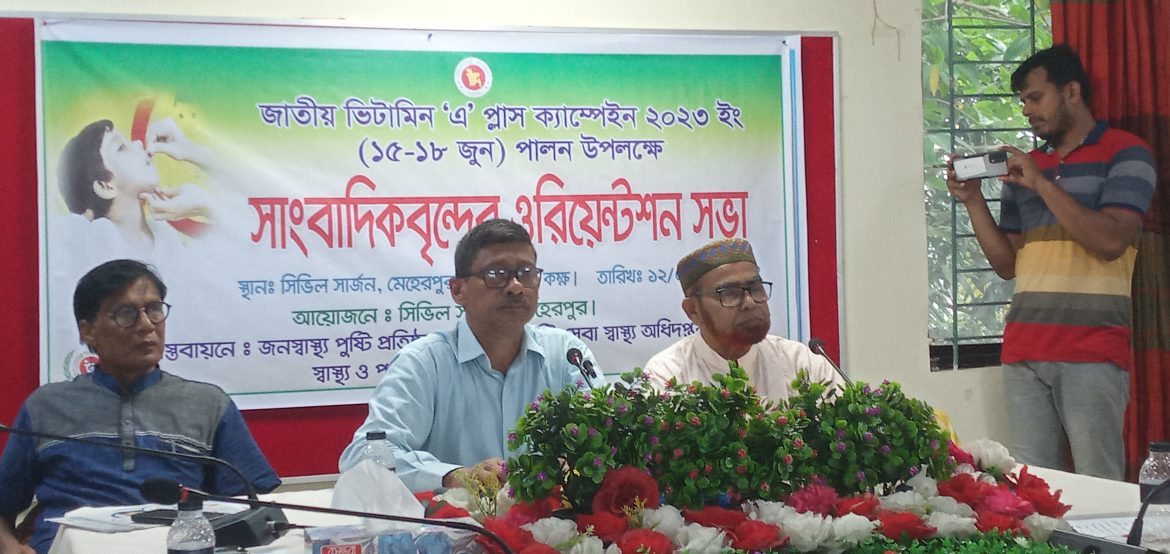 মেহেরপুর সিভিল সার্জনের নিজস্ব হলরুমে, অনুষ্ঠানে সভাপতিত্ব করেন মেহেরপুর জেলা সিভিল সার্জন ডঃ জওয়াহেরুল আনম সিদ্দিকী।অতিথি হিসেবে উপস্থিত ছিলেন মেহেরপুর প্রেসক্লাবের সভাপতি ফজলুল হক (মন্টু) সহ সভাপতি মহাসিনালী, মেহের আমজাদ, মেহেরপুর প্রেসক্লাবের সাবেক সাধারণ সম্পাদক রফিকুল আলম, মেহবুব প্রেসক্লাবের যুগ্ম সম্পাদক মাজেদুল হক (মনিক) মেহেরপুর প্রেসক্লাবের সাংগঠনিক সম্পাদক বেনিয়ামিন (মুক্ত) নির্বাহী সদস্য রাশেদুজ্জামান, আসিব ইকবাল, জাহিদুল ইসলাম, প্রথম আলোর জেলা প্রতিনিধি আবু সাঈদ, দৈনিক সংগ্রামের মেহেরপুর জেলা সংবাদদাতা আকতারুজ্জামান, সাংবাদিক তোফায়েল আহমেদ, সাজ্জাদ, জেলার প্রিন্ট মিডিয়া ও ইলেকট্রনিক্স মিডিয়া উপস্থিত ছিলেন । জেলা সিভিল সার্জন সাংবাদিকদের জানান জেলায় মোট ৪৬০ কেন্দ্রে ৬৮৬৫৭ শিশুকে ভ্যাকসিন এ প্লাস খাওয়ানোর লক্ষ্যমাত্রা ধরা হয়েছে। তবে কোন শিশু বাদ পড়লে যে জেলায় বা উপজেলায় খাওয়ানোর যাবে বলে তিনি জানান।