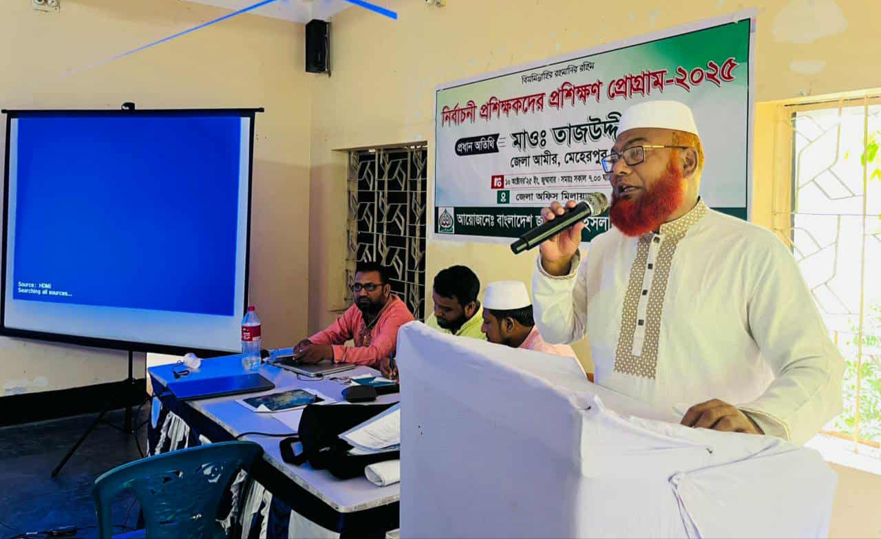 মেহেরপুর জেলা জামায়াতের নির্বাচনী প্রশিক্ষকদের প্রশিক্ষন প্রোগ্রাম/২৫ অনুষ্ঠিত হয়েছে। আজ( ১০ অক্টোবর) শুক্রবার সকাল ৭ সময় মেহেরপুর জেলা জামায়াতের অফিস অডিটরিয়ামে বাংলাদেশ জামায়াতে ইসলামী মেহেরপুর জেলা আমীর মাও, তাজউদ্দীন খানের সভাপতিত্বে করেন। প্রশিক্ষন প্রোগ্রাম পরিচালনা করেন জেলা জামায়াতের সেক্রেটারি জনাব ইকবাল হোসেন। জেলা আমীর, জেলা সেক্রেটারিসহ প্রশিক্ষন দিলেন জেলা জামায়াতের প্রচার ও মিডিয়া বিভাগের সেক্রেটার ও মুজিবনগর উপজেলা জামায়াতে সেক্রেটারি.খাইরুল বাসার জেলা মিডিয়া বিভাগের সহকারী আব্দুল জাব্বার,উপস্থিত ছিলেন জেলা নায়েবে আমীর মাও মাহবুব উল আলম, মেহেরপুর সদর জামায়াতের আমীর মাও, সোহেল রানা,মুজিবনগর উপজেলা আমীর মাও,খানজাহান আলী,মেহেরপু পৌর জামায়াতের আমীর জনাব সোহেল রানা ডলার,নির্বচনী কাজে জনশক্তিকে আরও দক্ষ করে গড়ে তোলার জন্য মেহেরপুর-১ ও ২ আসনের দায়িত্বশীলদের এই প্রশিক্ষনের আয়োজন করা হয়েছে।