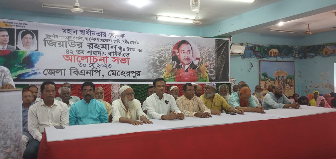 মেহেরপুর জেলা বিএনপির উদ্যোগে শহীদ রাষ্ট্রপতি জিয়াউর রহমানের ৪২ তম শাহাদাত বার্ষিকী উপলক্ষে আলোচনা অনুষ্ঠিত হয় । গতকাল সকাল দশটার সময় মেহেরপুর পৌর কমিউনিটি সেন্টারে আলোচনা সভায় সভাপতিত্ব করেন মেহেরপুর জেলা বিএনপির সভাপতি ও সাবেক সংসদ সদস্য মাসুদ অরুন।