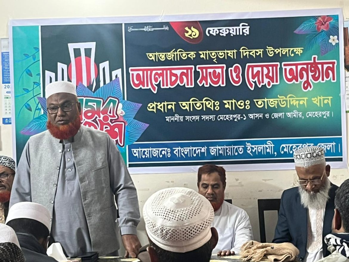 যথাযথ মর্যাদায় ২১ ফেব্রুয়ারী আন্তর্জাতিক মাতৃভাষা ও শহীদ দিবস উপলক্ষে পৌর জামায়াতের আয়োজনে আলোচনা সভা ও দোয়া অনুষ্ঠান। আলোচনা সভায় সভাপতিত্ব করেন পৌর আমীর সোহেল রানা ডলার। প্রধান অতিথি হিসেবে উপস্থিত ছিলেন মেহেরপুর – মুজিবনগর ১ আসনের নবনির্বাচিত সংসদ সদস্য মাওলানা তাজউদ্দীন খান, বিশেষ অতিথি নায়েবে আমীর মাওলানা মাহবুব উল আলম, জেলা সেক্রেটারি ইকবাল হুসাইন, জেলা রাজনৈতিক সেক্রেটারি কাজী রুহুল আমিন, জেলা সূরা ও কর্ম পরিষদের সদস্য ও বি, ম,এ সভাপতি ডাক্তার আব্দুস সালাম, সদর উপজেলা আমীর মাওলানা সোহেল রানা, শ্রমিক কল্যাণ ফেডারেশনের সভাপতি আব্দুর রউফ মুকুল, সদর উপজেলা সেক্রেটারি মাস্টার আব্দুল জাব্বার, সহ জামায়াতের নেতাকর্মীরা উপস্থিত ছিলেন। আলোচনা শেষ শহীদদের আত্মার মাগফিরাত কামনা করে দোয়া ও মোনাজাত করেন।