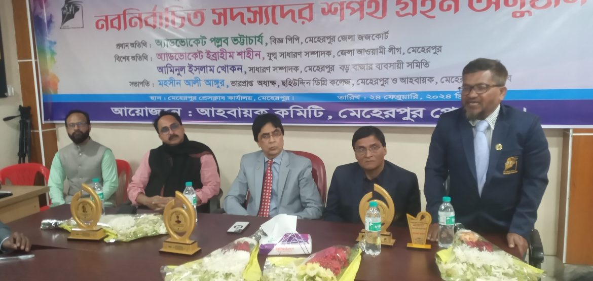 সভাপতি – মোহাঃ মহসিন আলী আঙ্গুর,ভারপ্রাপ্ত অধ্যক্ষ, ছহিউদ্দিন ডিগ্রি কলেজ, মেহেরপুর ও আহবায়ক, মেহেরপুর প্রেসক্লাব। বক্তব্য রাখেন জাহির হোসেন (চঞ্চল) অধ্যাপক মুজিবনগর ডিগ্রী কলেজ ও আহবায়ক মেহেরপুর প্রেসক্লাব, নবনির্বাচিত সভাপতি ফজলুল হক( মন্টু), সাধারণ সম্পাদক মাজেদুল হক (মানিক), সিনিয়র সাংবাদিক তুহিনা অরণ্য , সহ-সভাপতি ফারুক মল্লিক, যুগ্ম সাধারণ সম্পাদক মক্ত, আকতারুজ্জামান সহ অন্যান্য সাংবাদিকবৃন্দ। অন্যান্যরা উপস্থিত ছিলেন।