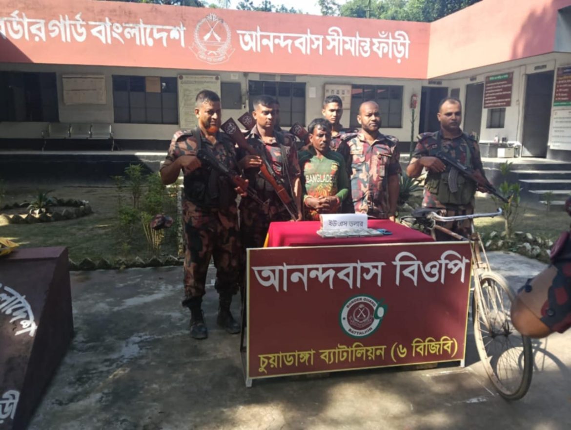 চুয়াডাঙ্গা ব্যাটালিয়ন (০৬বিজিবি) অধীনস্থ মুজিবনগর উপজেলার আনন্দবাস বিওপির বিশেষ টহল দল কর্তৃক এডি মোঃ হায়দার আলী নেতৃত্বে আনন্দবাস বিওপির দায়িত্বপূর্ণ এলাকার সীমান্ত মেইন পিলার ৯৯ হতে আনুমানিক ২০০ গজ বাংলাদেশের অভ্যন্তরে ফাঁসিতলা মাঠ নামক স্থান হতে us ডলার সহ ১ জনকে আটক করেছেন বিজিবি। আটককৃত হলেন মৃত আফসার শেখের ছেলে মোঃ জাহাঙ্গীর শেখ (৪০), গ্রাম আনন্দবাস, থানা মুজিবনগর, জেলা মেহেরপুর কে আমেরিকান ৫১০০০ ডলার ও বাংলাদেশী ৬১৯৮৫৪০/-সহ আটক করা হয়। ২০০০ হাজার টাকা মুল্যের একটি বাইসাইকেল ও ১টি বাটন ফোন জব্দ করা হয়। আসামি মুজিবনগর থানায় হস্তান্তর করা হয়েছে।