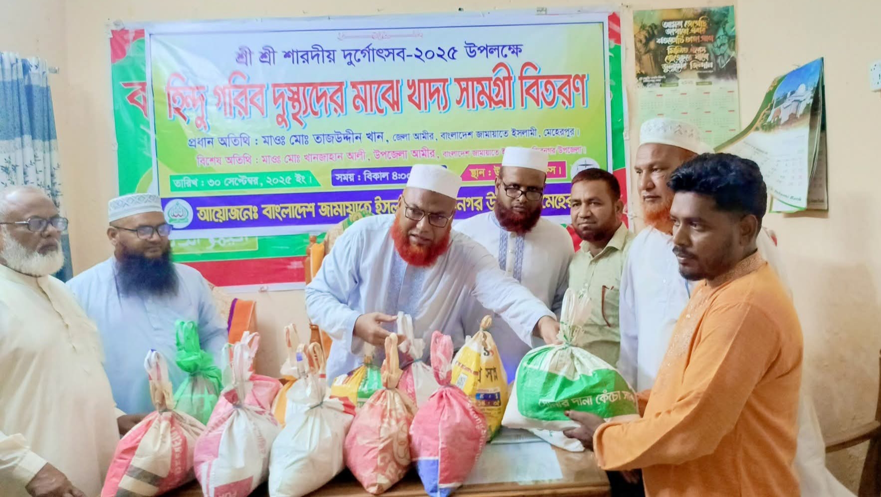 বাংলাদেশ জামায়াতে ইসলামীর উদ্যোগে মেহেরপুর মুজিবনগর উপজেলায় শ্রী শ্রী শারদীয় দুর্গোৎসব উপলক্ষে ৫৪ পরিবার হিন্দু, গরিব দুস্থ্যদের মাঝে খাদ্য সামগ্রী বিতরণ করা হয়েছে। খাদ্য বিতরণ অনুষ্ঠানের প্রধান অতিথি হিসেবে উপস্থিত ছিলেন মুজিবনগর- মেহেরপুর ১ আসনে সংসদ সদস্য প্রার্থী ও মেহেরপুর জেলা জামায়াতের আমীর মাওলানা তাজ উদ্দিন খান। বিশেষ অতিথি হিসেবে উপস্থিত ছিলেন উপজেলা আমীর মাও. খানজাহান আলী মুজিবনগর উপজেলা নায়েবে আমীর মাওলানা ফিরাতুল ইসলাম, মুজিবনগর উপজেলা সেক্রেটারি মোঃ খাইরুল বাসার, মুজিবনগর উপজেলার সহকারী সেক্রেটারি জনাব মোস্তাফিজুর রহমান, উপজেলা শ্রমিক কল্যান সভাপতি জনাব ফজলুল হক গাজী, উপজেলা সমাজ কল্যান সেক্রেটারি জনাব আমিনুল হক,বাগোয়ান ইউনিয়ন আমীর মাও. ফারুক হোসেন। মুজিবনগর উপজেলার সনাতন ধর্মীয় সাধারণ মানুষ জেলা জামায়াতের আমীরকে সনাতন ধর্মীয় মানুষগুলোর পক্ষ থেকে ধন্যবাদ জানিয়েছেন। জামায়াতে ইসলামী এই ধরনের কার্যক্রম অব্যাহত রাখার আহ্বান জানান।