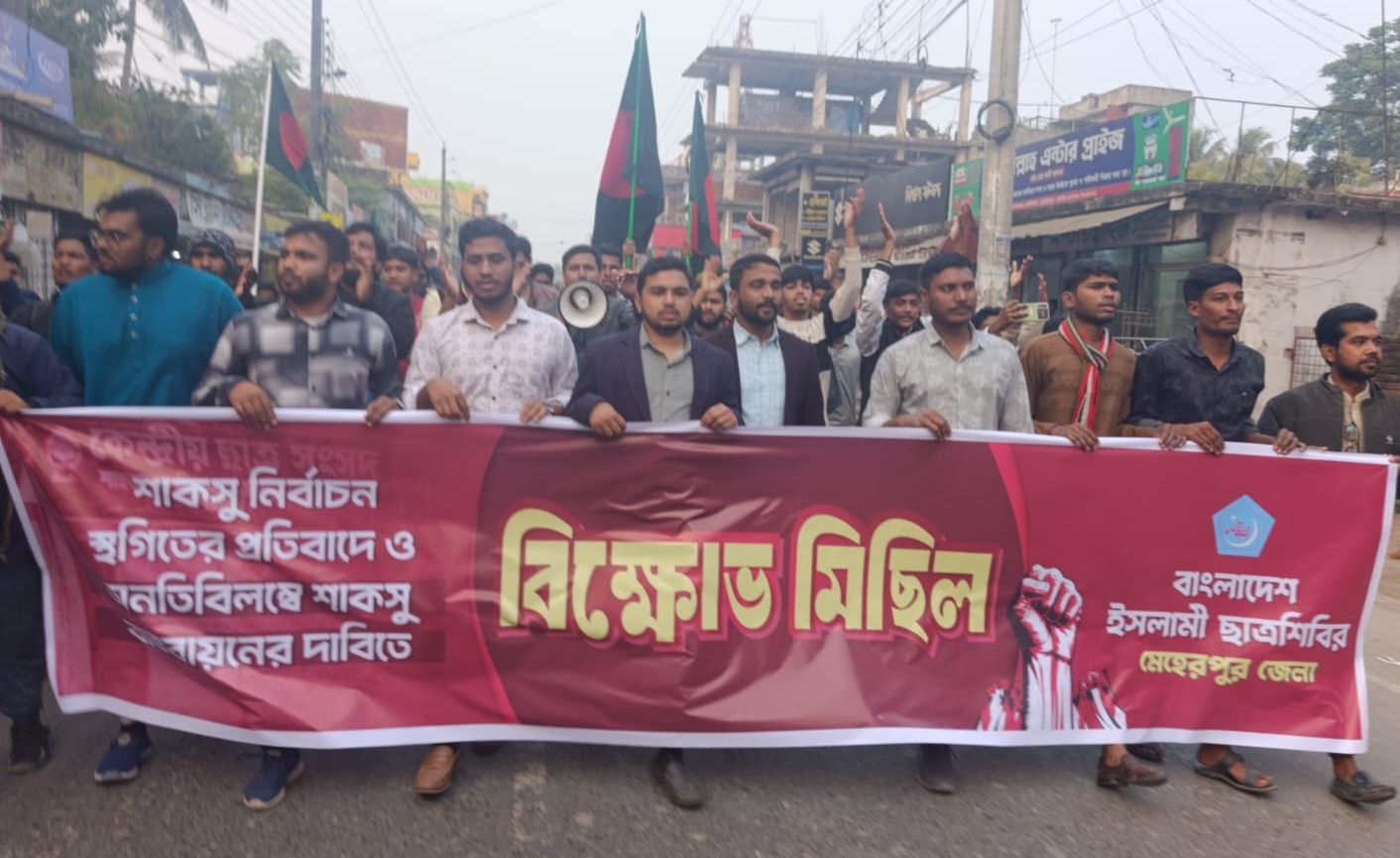 বুধবার (২১জানুয়ারি-২৬) বাদ আছর  মেহেরপুর শহরের গড় মসজিদ প্রাঙ্গণ থেকে ইসলামী ছাত্র শিবিরের বিক্ষোভ মিছিল শুরু হয়ে কোট চত্বরে গিয়ে শেষ হয়। বিক্ষোভ মিছিলে বক্তব্য রেখেছেন মেহেরপুর জেলা ছাত্রশিবিরের সভাপতি আব্দুস সালাম, সাধারণ সম্পাদক সাইদুর রহমানসহ অন্যান্যরা বক্তব্য রাখেন। এই বিক্ষোভ মিছিলে শিবিরের নেতাকর্মীরা উপস্থিত ছিলেন। বক্তারা বলেন  বিগত আওয়ামী লীগ সরকার এই ধরনের নির্বাচন বাঁধাগ্রস্ত করার কারণে এবং দিনের ভোট রাত্রে করার অপরাধে ফ্যাসিবাদ হয়ে উঠেছিল আমরা দেখছি স্বৈরাচার সরকারের মত। বক্তারা বলেন, এতে বাংলাদেশের মানুষ মেনে নেবে না। অবিলম্বে শাহজালাল প্রযুক্তি বিশ্ববিদ্যালয়ে নির্বাচন দিতে হবে।